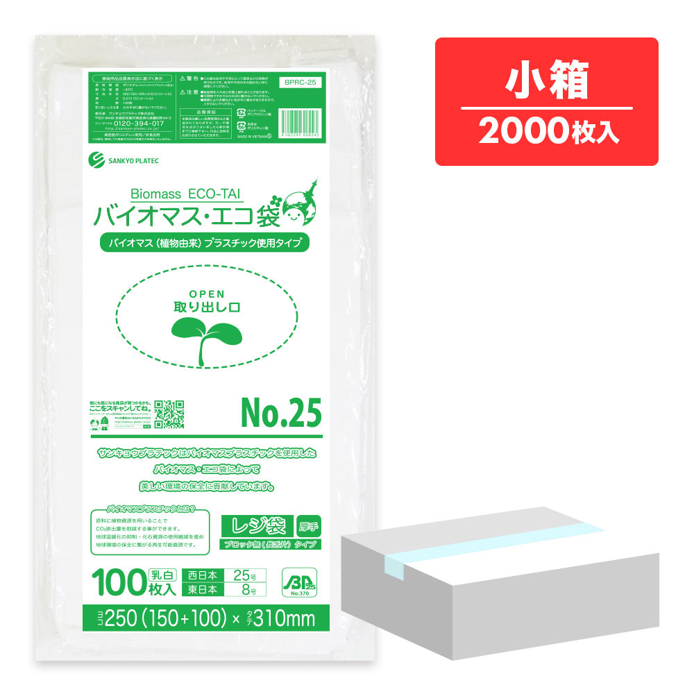 バイオマスプラスチック 25%配合 レジ袋 薄手 西日本 25号 (東日本8号) ブロック有 乳白 0.011mm厚 100枚x20冊 BPRSK-25kobako /手さげ袋 買い物袋 袋 SS 業務用
