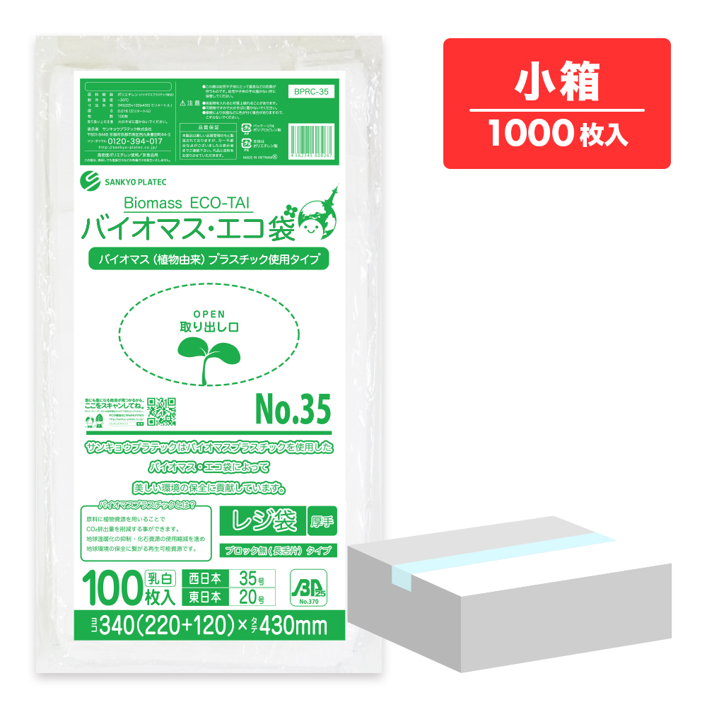バイオマスプラスチック 25%配合 レジ袋 厚手 長舌片タイプ 西日本 35号 (東日本20号) ブロック無 乳白 0.016mm厚 100枚x10冊 BPRC-35kobako /手さげ袋 買い物袋 袋 M 業務用