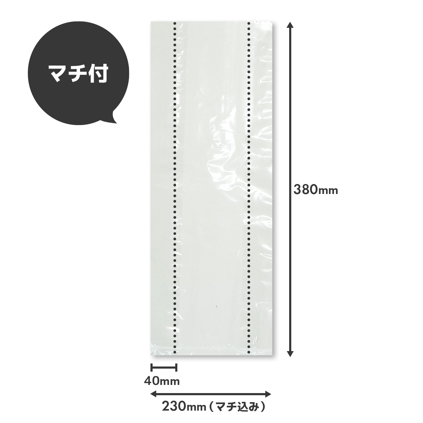 | 横×縦×厚さ(mm) | 230(150+マチ80)x380x0.025 |