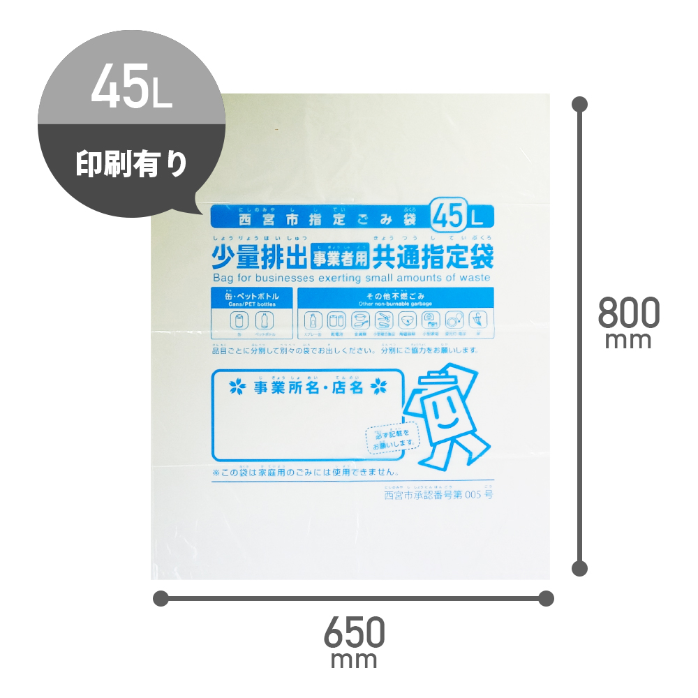 袋に『西宮市指定ごみ袋45L 少量排出事業者用共通指定袋』と印字があります。