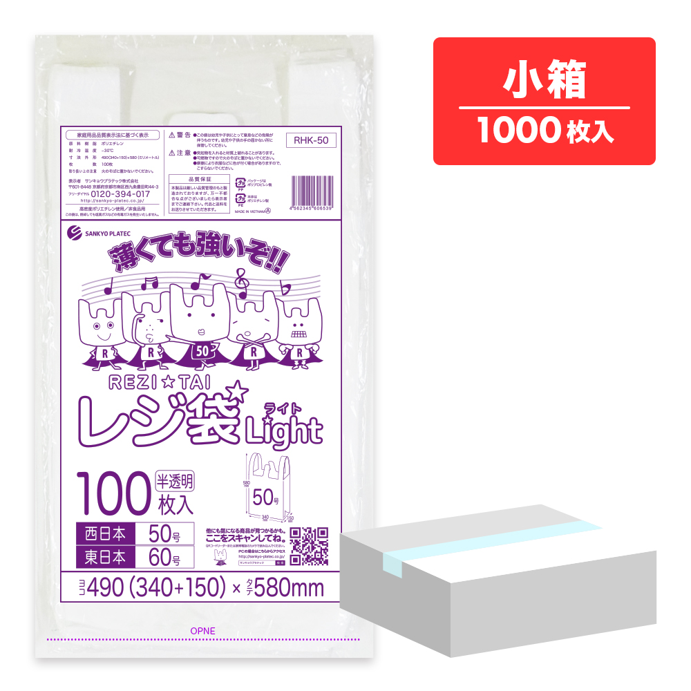 レジ袋 薄手 西日本 50号 (東日本60号) ブロック有 半透明 0.018mm厚 100枚x10冊 RHK-50kobako /手さげ袋 買い物袋 袋 3L 業務用