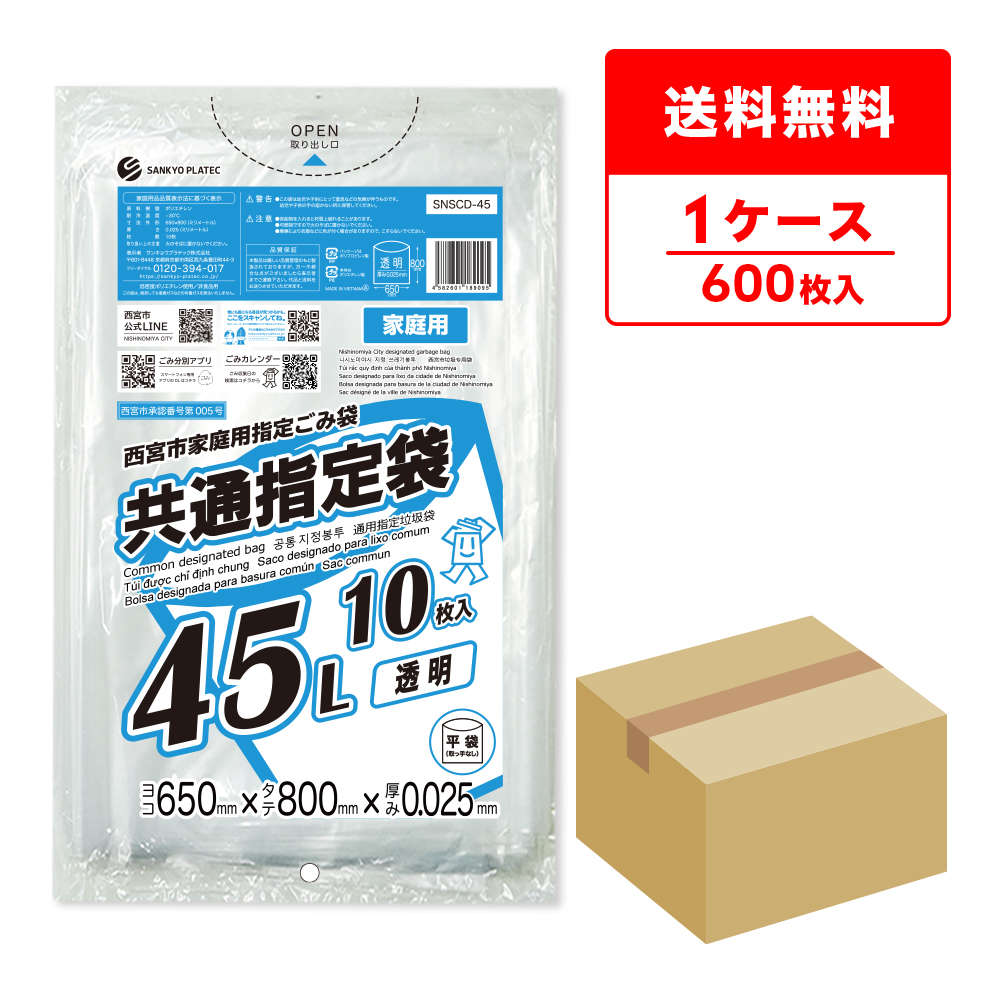 西宮市家庭用指定ごみ袋 共通指定袋 45リットル 透明 65x80cm 0.025mm厚 10枚x60冊 SNSCD-45 ポリ袋 ゴミ袋 平袋 西宮市 家庭 45l 送料無料 激安 最安値