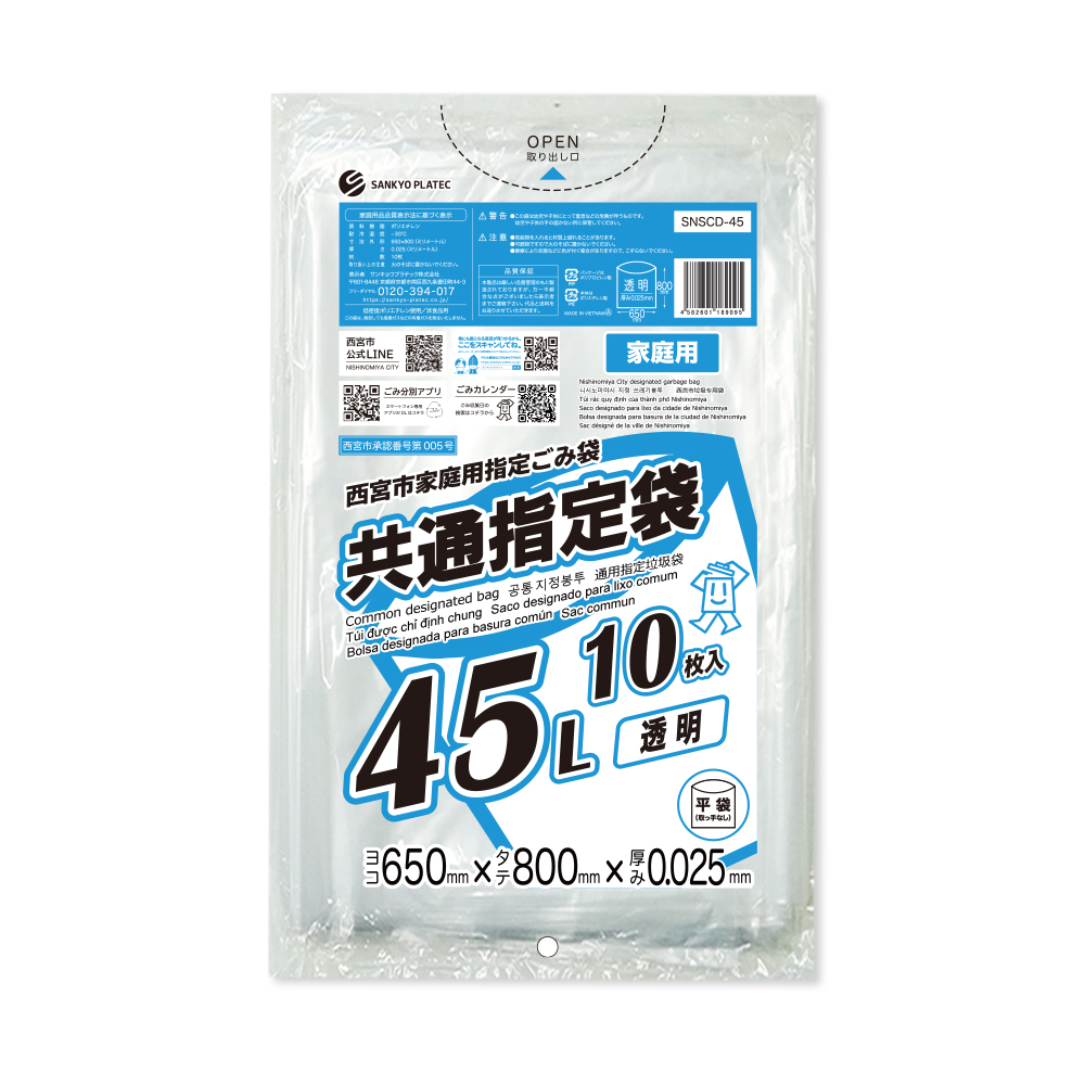 西宮市家庭用指定ごみ袋 共通指定袋 45リットル 透明 65x80cm 0.025mm厚 10枚 SNSCD-45bara ポリ袋 ゴミ袋 平袋 西宮市 家庭 45l 激安 最安値
