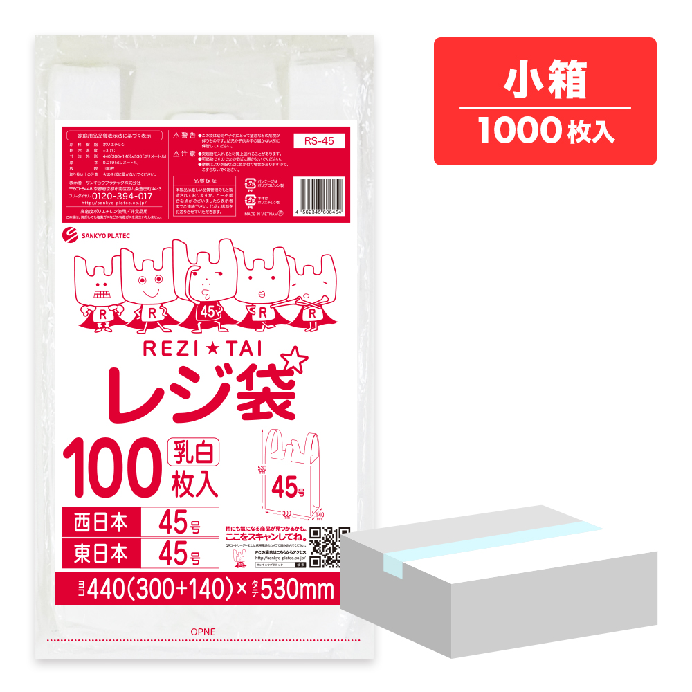 レジ袋 厚手 西日本 45号 (東日本45号) ブロック有 乳白 0.019mm厚 100枚x10冊 RS-45kobako/ 手さげ袋 買い物袋 袋 業務用 LL ホワイト