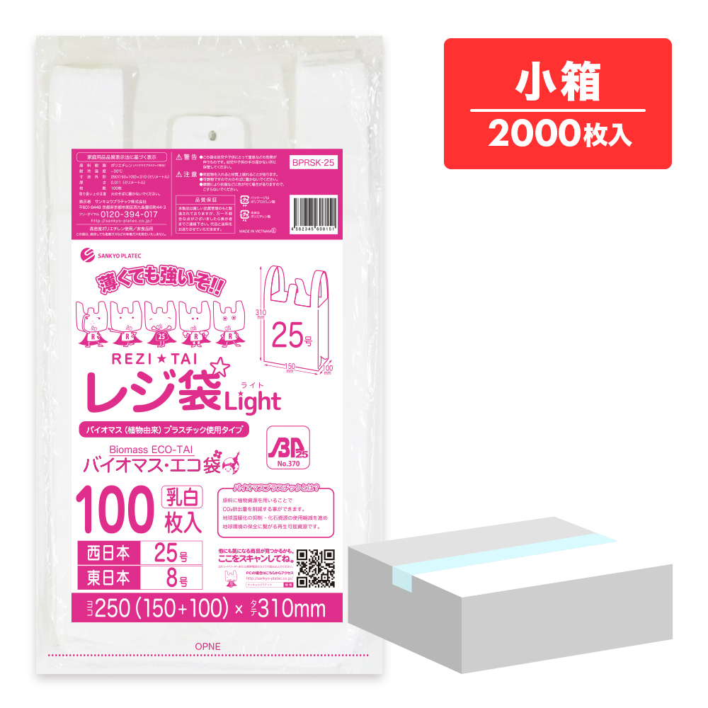 バイオマスプラスチック 25%配合 レジ袋 薄手 西日本 25号 (東日本8号) ブロック有 乳白 0.011mm厚 100枚x20冊 BPRSK-25kobako /手さげ袋 買い物袋 袋 SS 業務用