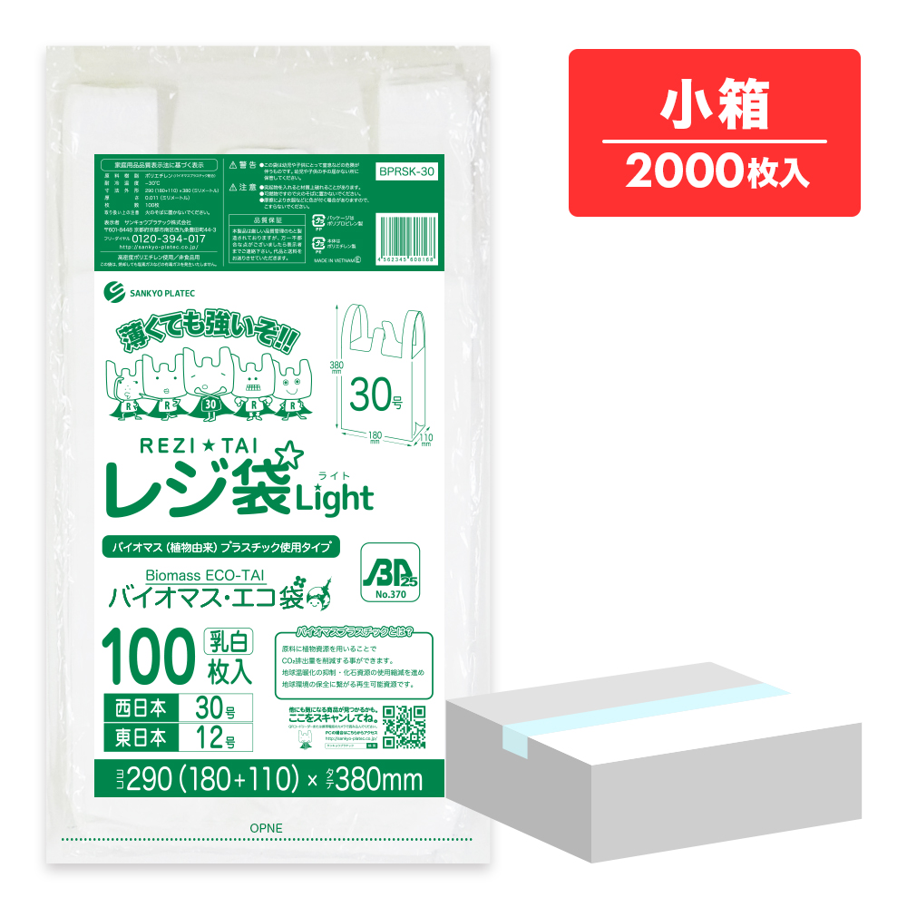 バイオマスプラスチック 25%配合 レジ袋 薄手 西日本 30号 (東日本12号) ブロック有 乳白 0.011mm厚 100枚x20冊 BPRSK-30kobako /手さげ袋 買い物袋 袋 S 業務用