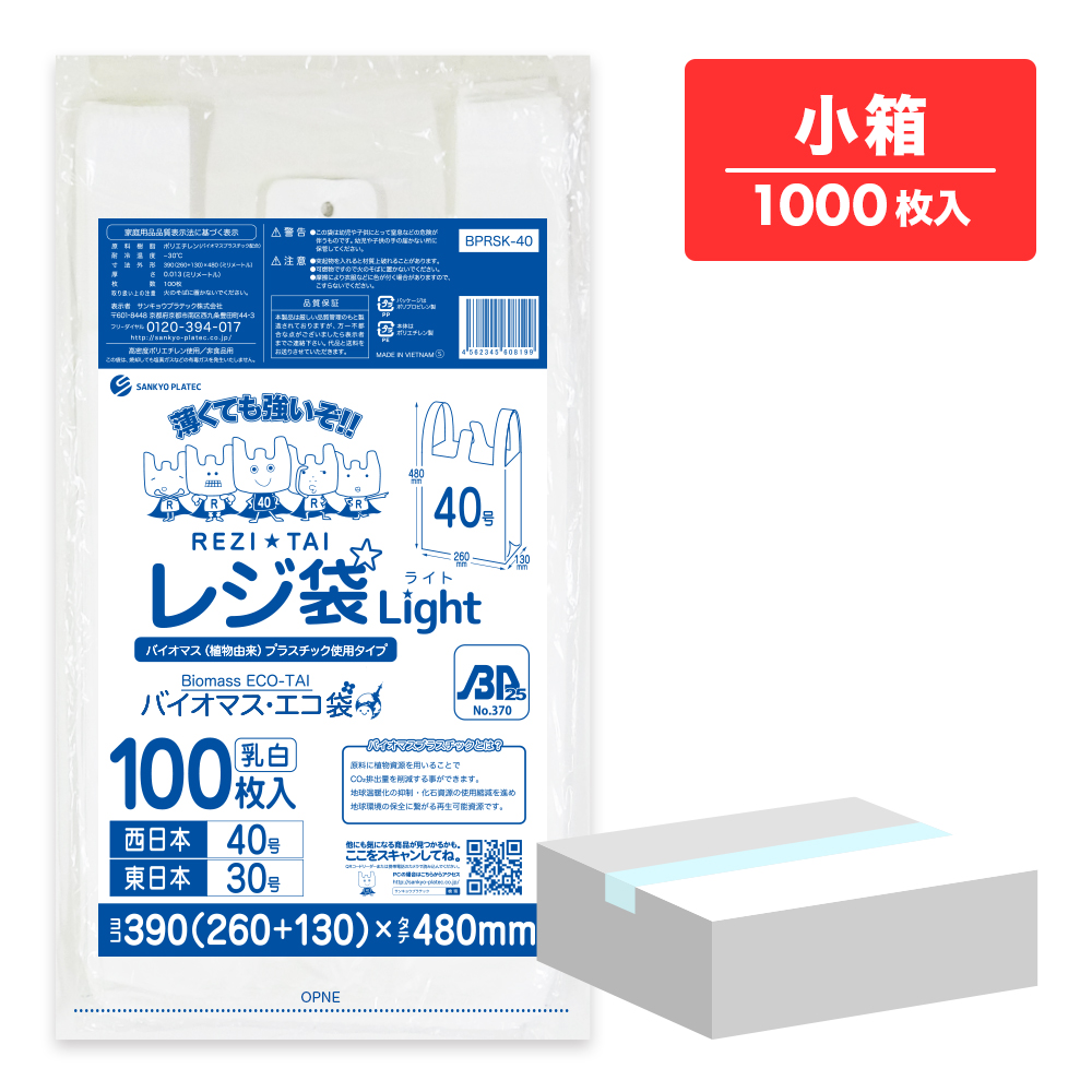 バイオマスプラスチック 25%配合 レジ袋 薄手 西日本 40号 (東日本30号) ブロック有 乳白 0.013mm厚 100枚x10冊 BPRSK-40kobako /手さげ袋 買い物袋 袋 L 業務用