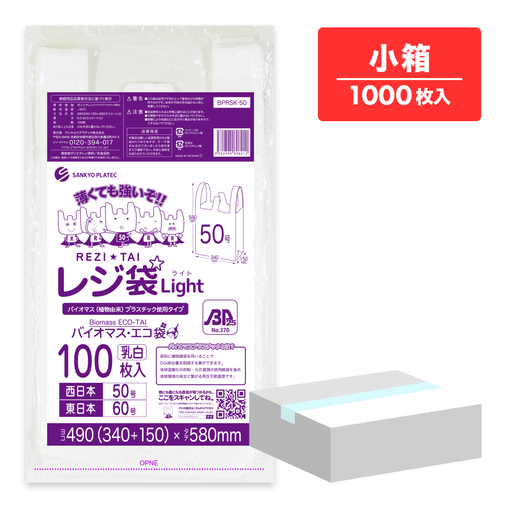 バイオマスプラスチック 25%配合 レジ袋 薄手 西日本 50号 (東日本60号) ブロック有 乳白 0.018mm厚 100枚x10冊 BPRSK-50kobako /手さげ袋 買い物袋 袋 3L 業務用