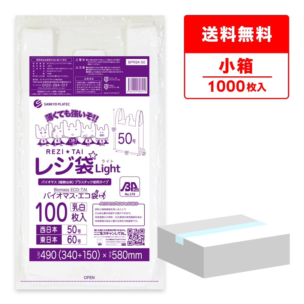 バイオマスプラスチック 25%配合 レジ袋 薄手 西日本 50号 (東日本60号) ブロック有 乳白 0.018mm厚 100枚x10冊 BPRSK-50kobako /手さげ袋 買い物袋 袋 3L 業務用 送料無料