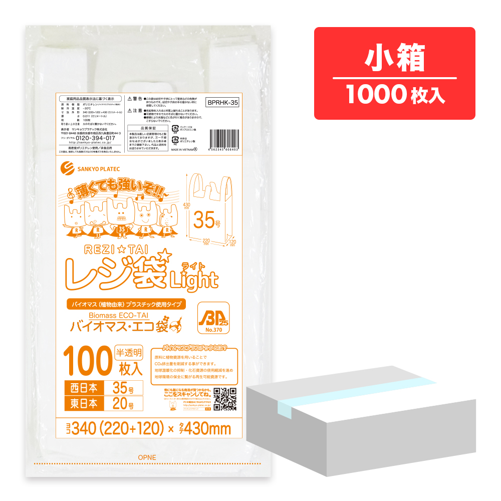 バイオマスプラスチック 25%配合 レジ袋 薄手 西日本 35号 (東日本20号) ブロック有 半透明 0.011mm厚 100枚x10冊 BPRHK-35kobako /手さげ袋 買い物袋 袋 M 業務用