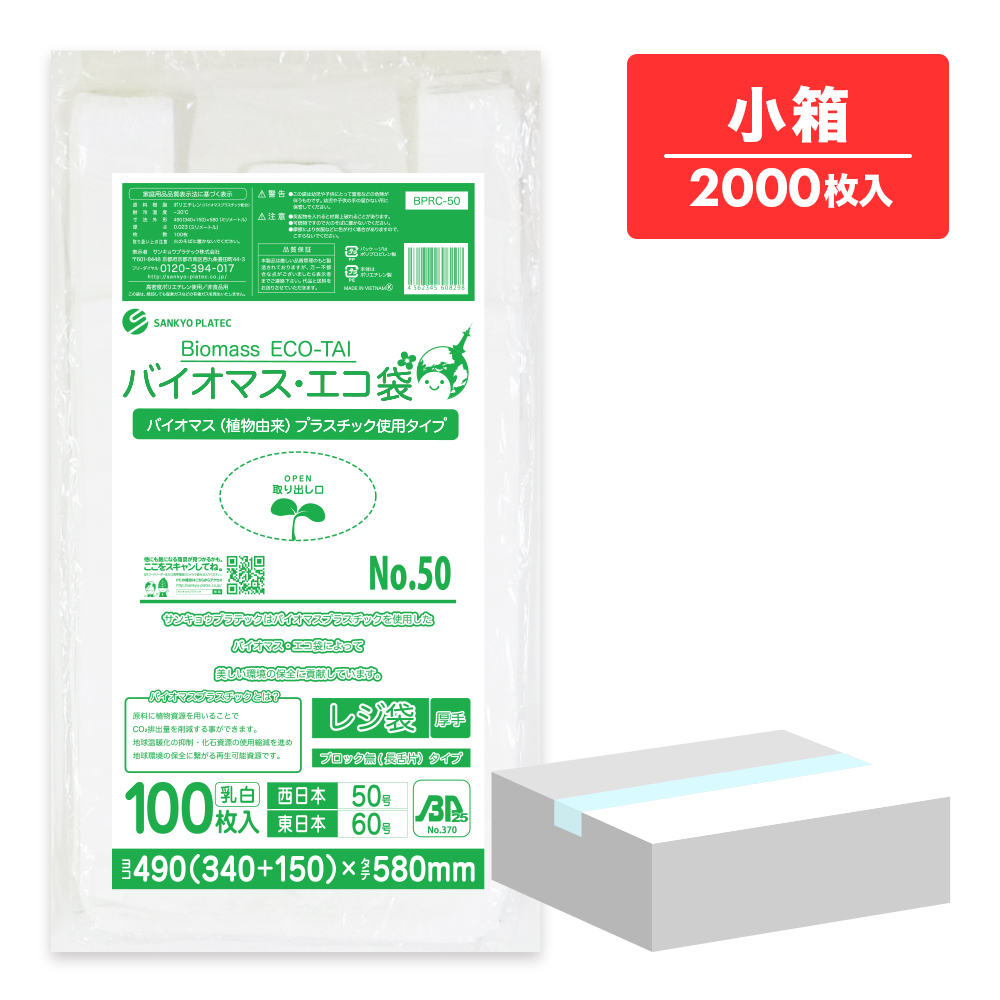 バイオマスプラスチック 25%配合 レジ袋 厚手 長舌片タイプ 西日本 50号 (東日本60号) ブロック無 乳白 0.023mm厚 100枚x10冊 BPRC-50kobako /手さげ袋 買い物袋 袋 3L 業務用