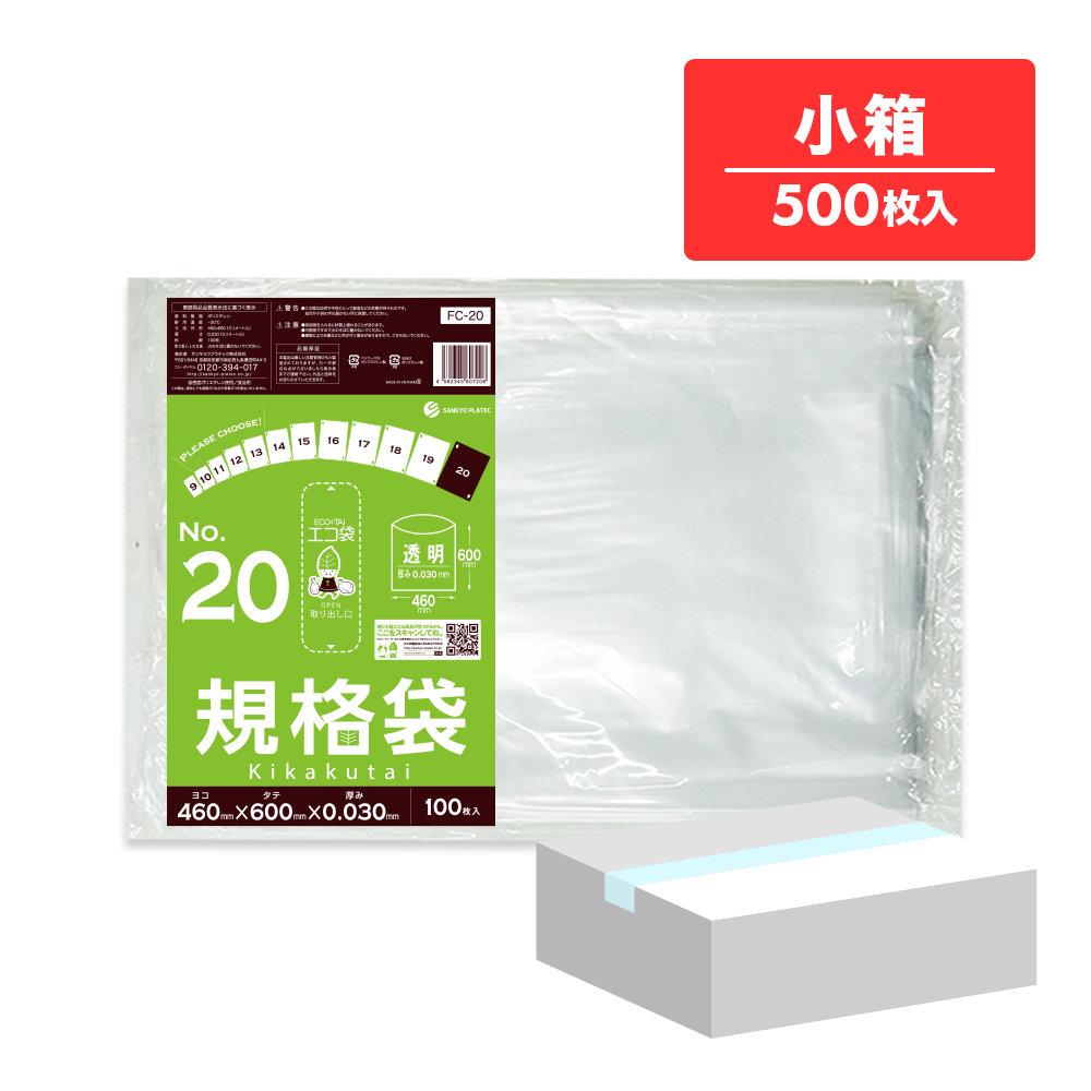 規格袋 20号 透明 46x60cm 0.030mm厚 100枚x5冊 FC-20kobako 食品検査適合 食品対応 袋 保存袋 食品用 検食 仕分け 梱包 No.20 クリア 業務用