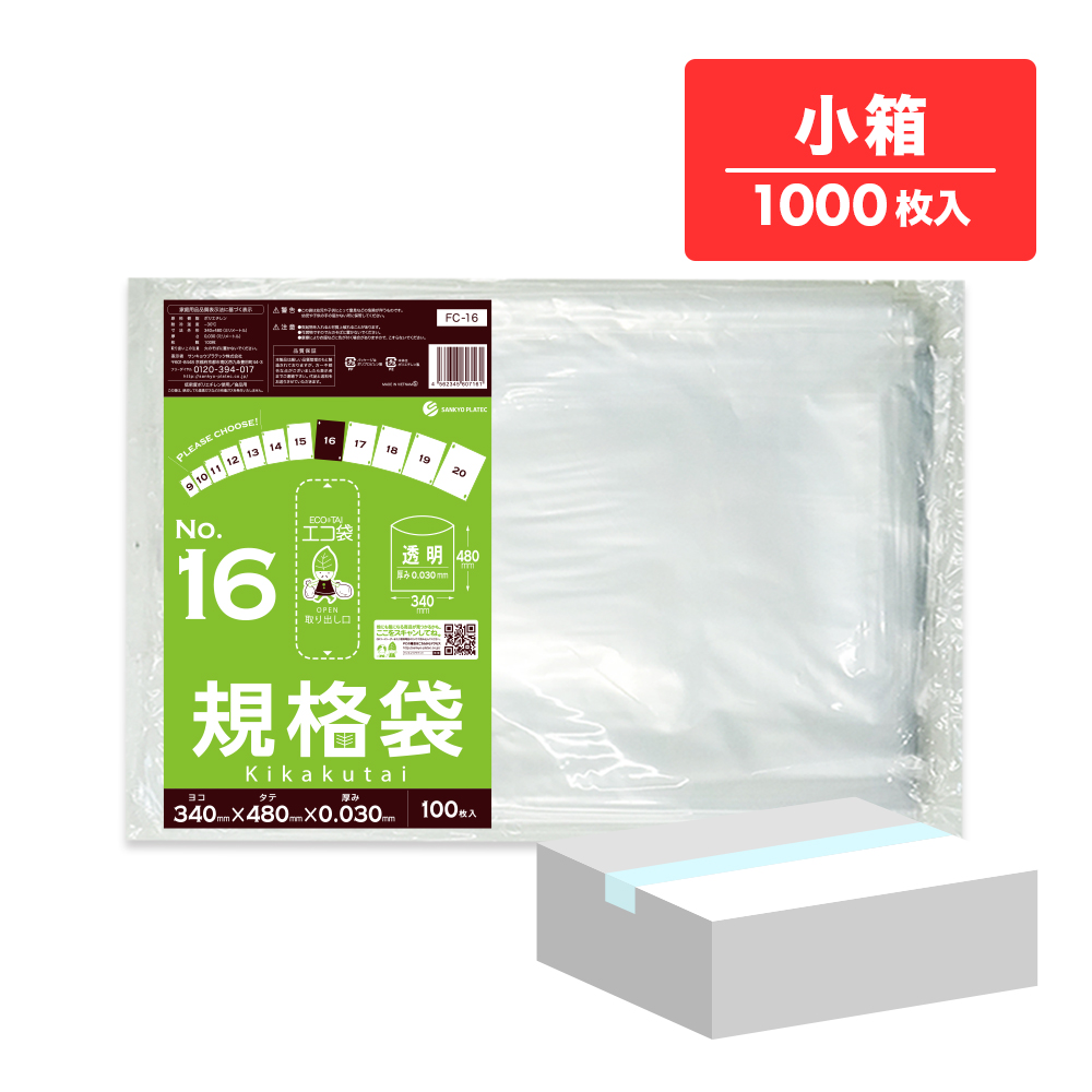 規格袋 16号 透明 34x48cm 0.030mm厚 100枚x10冊 FC-16kobako 食品検査適合 食品対応 袋 保存袋 食品用 検食 仕分け 梱包 No.16 クリア 業務用