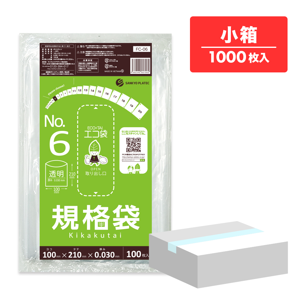 規格袋 6号 透明 10x21cm 0.030mm厚 100枚x10冊 FC-06kobako 食品検査適合 食品対応 袋 保存袋 検食用 仕分け 梱包 No.6 クリア 業務用