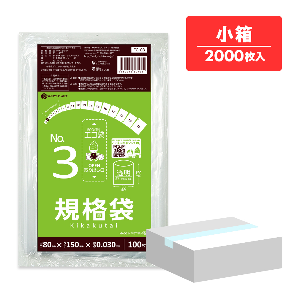 規格袋 3号 透明 8x15cm 0.030mm厚 100枚x20冊 FC-03kobako 食品検査適合 食品対応 袋 保存袋 検食用 仕分け 梱包 No.3 クリア 業務用