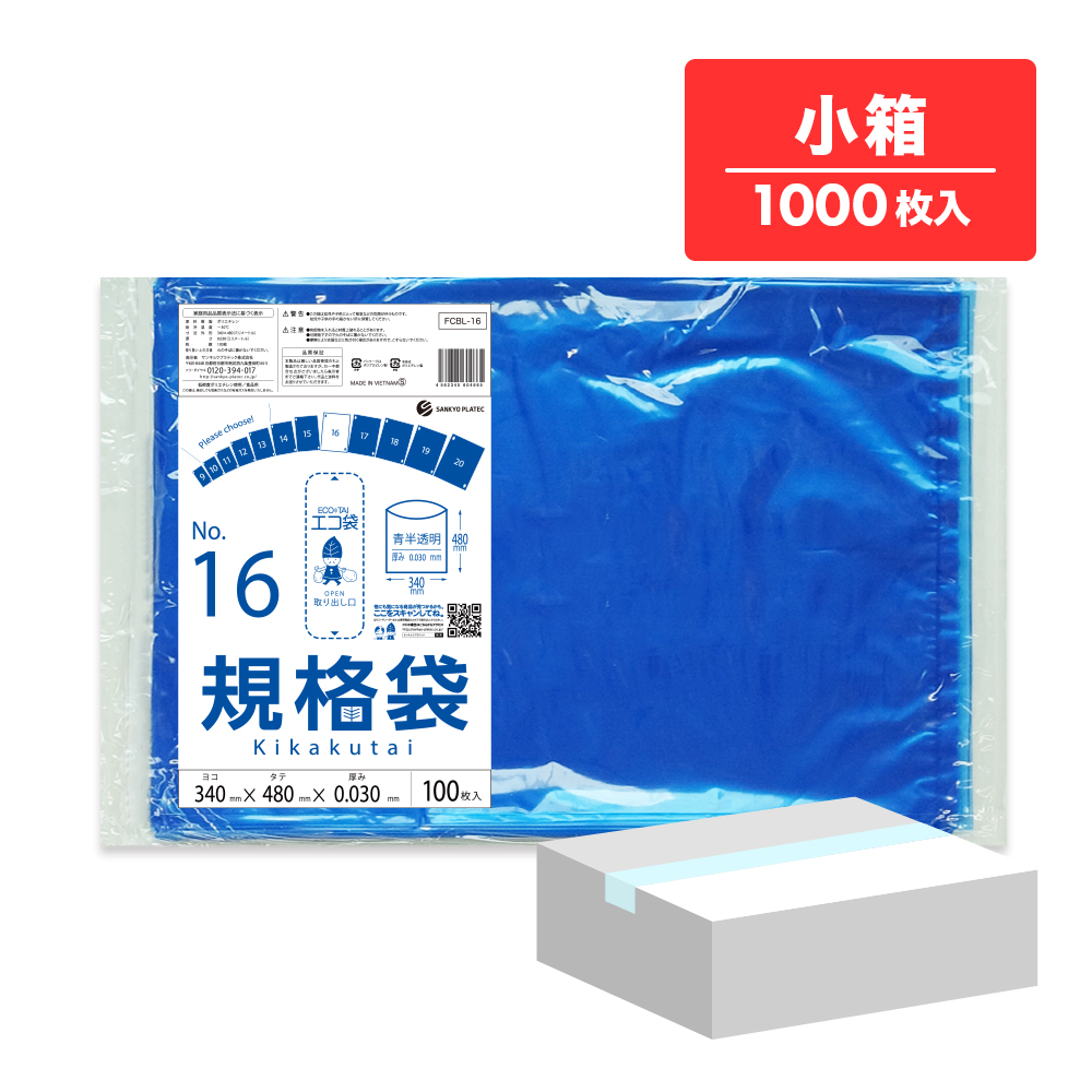 規格袋 16号 青半透明 34x48cm 0.030mm厚 100枚x10冊 FCBL-16kobako 食品検査適合 食品対応 袋 保存袋 食品用 検食 仕分け 梱包 No.16 ブルー 業務用