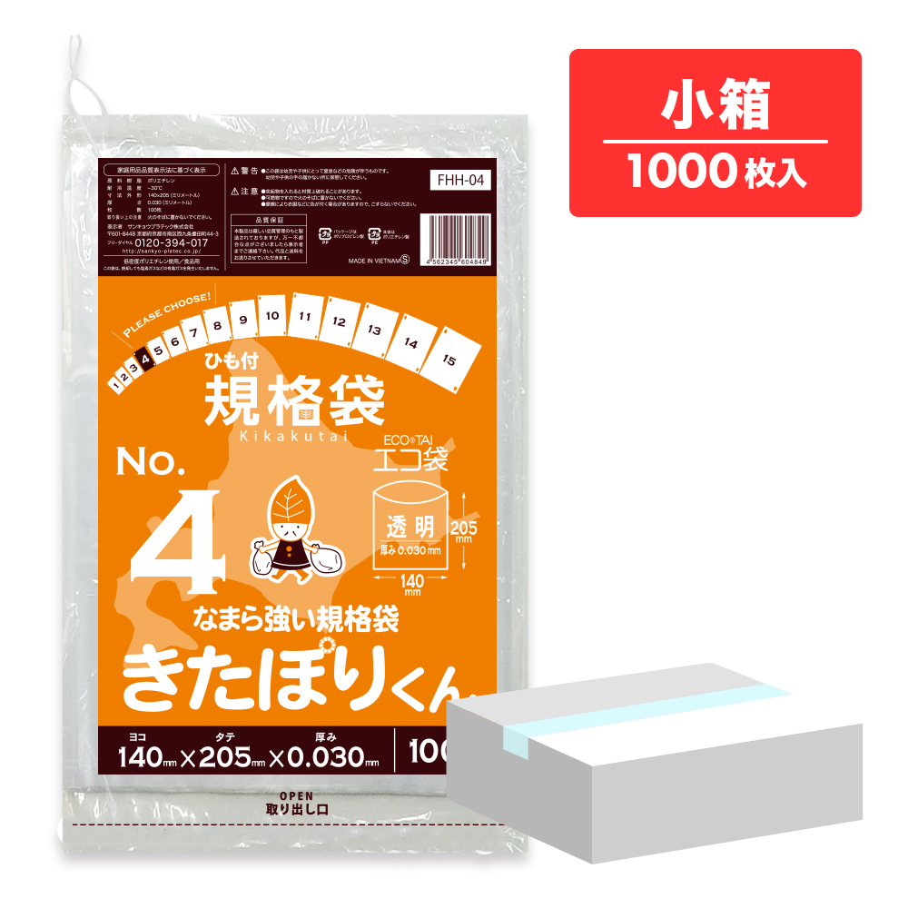 FHH-04kobako きたぽりくん 北海道規格 ひも付 規格袋 4号 0.030mm厚 透明 100枚×10冊