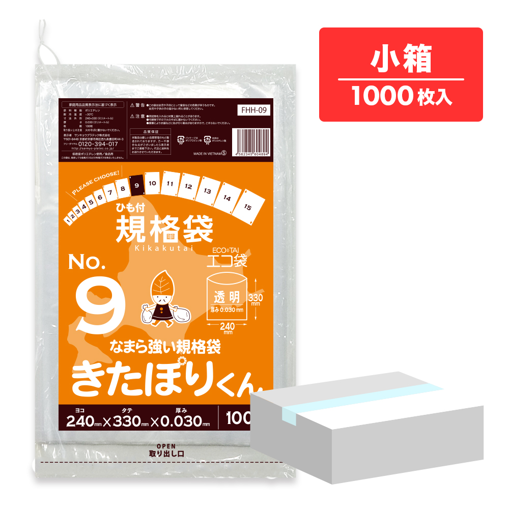 FHH-09kobako きたぽりくん 北海道規格 ひも付 規格袋 9号 0.030mm厚 透明 100枚×10冊