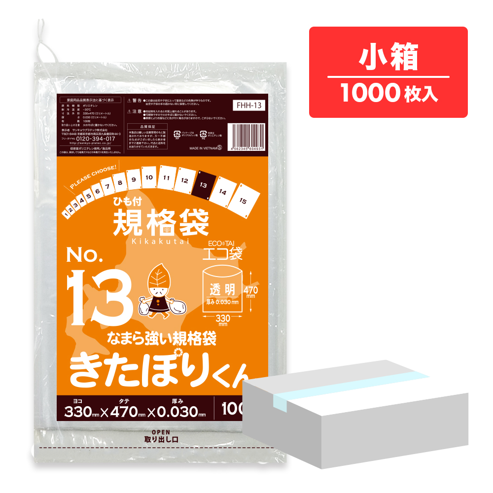 FHH-13kobako きたぽりくん 北海道規格 ひも付 規格袋 13号 0.030mm厚 透明 100枚×10冊