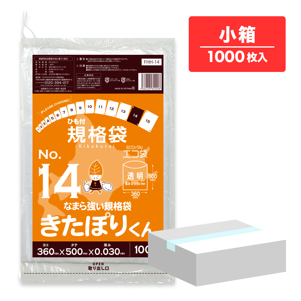 FHH-14kobako きたぽりくん 北海道規格 ひも付 規格袋 14号 0.030mm厚 透明 100枚×10冊