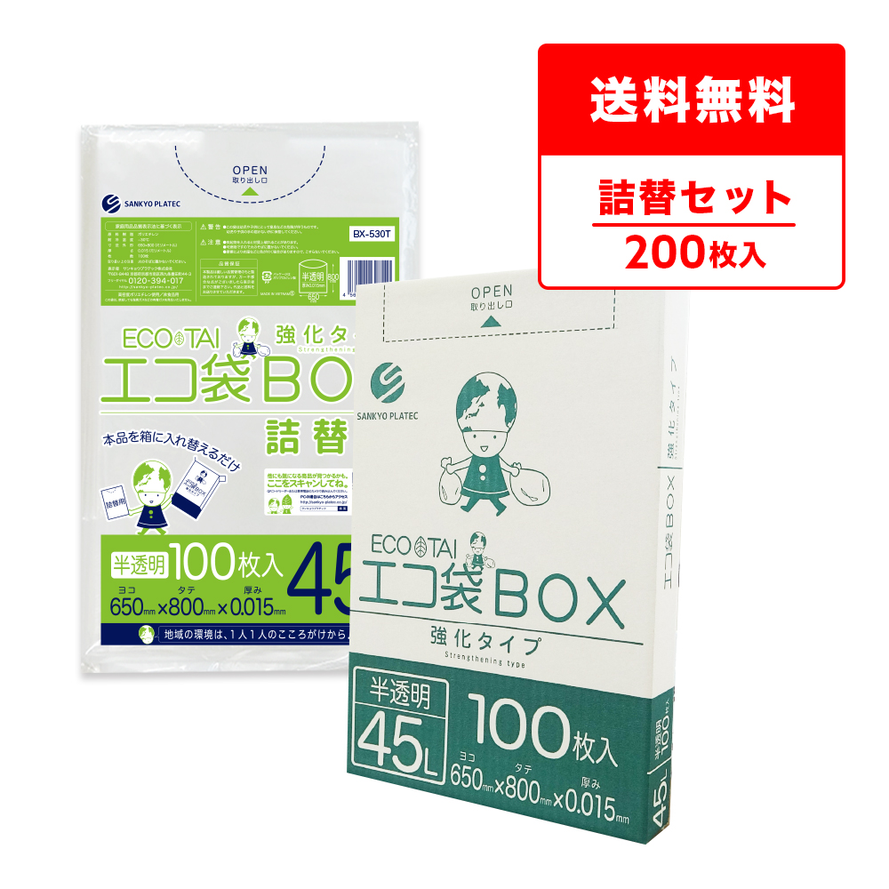 ごみ袋 45リットル 薄手 半透明 65x80cm 0.015mm厚 1小箱(100枚)+詰替用(100枚) BX-530kt / ポリ袋 ゴミ袋 平袋 袋 45l ナチュラル 業務用