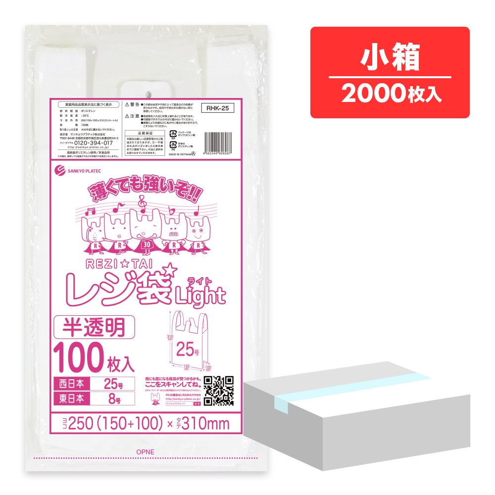 レジ袋 薄手 西日本 25号 (東日本8号) ブロック有 半透明 0.011mm厚 100枚x20冊 RHK-25kobako /手さげ袋 買い物袋 袋 SS 業務用
