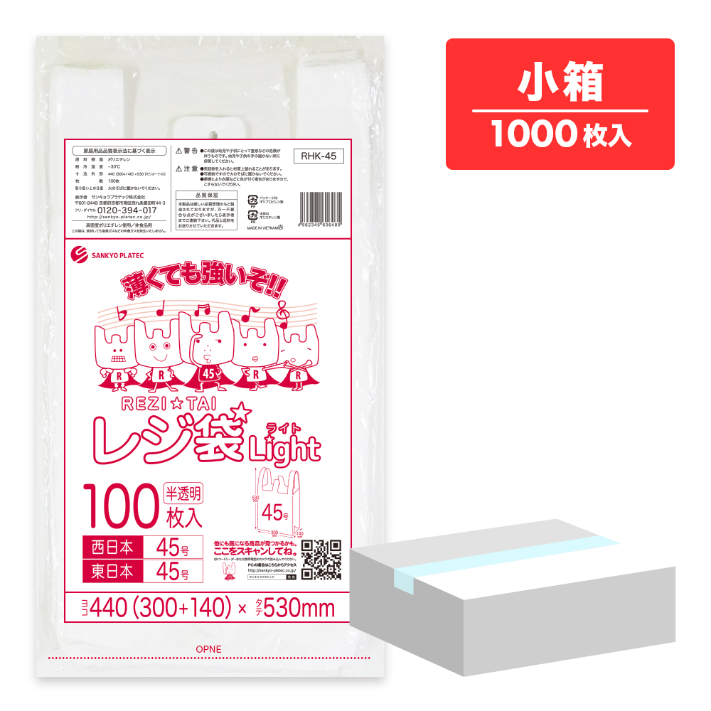 レジ袋 薄手 西日本 45号 (東日本45号) ブロック有 半透明 0.016mm厚 100枚x10冊 RHK-45kobako /手さげ袋 買い物袋 袋 LL 業務用