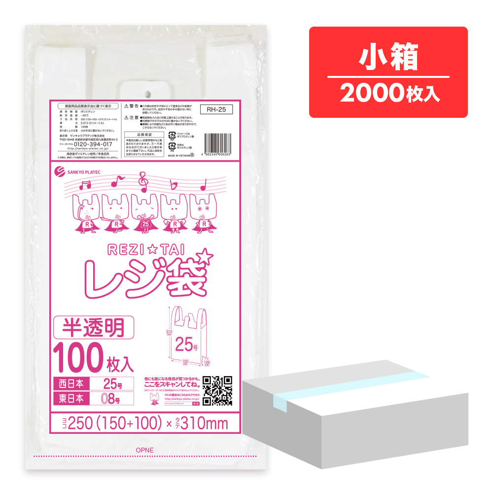 レジ袋 厚手 西日本 25号 (東日本8号) ブロック有 半透明 0.013mm厚 100枚x20冊 RH-25kobako /手さげ袋 買い物袋 袋 SS 業務用