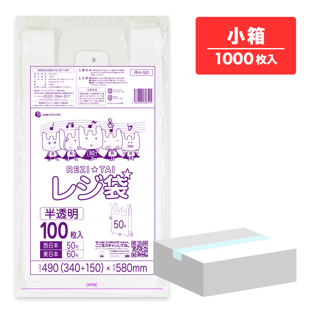 レジ袋 厚手 西日本 50号 (東日本60号) ブロック有 半透明 0.023mm厚 100枚x10冊 RH-50kobako /手さげ袋 買い物袋 袋 3L 業務用