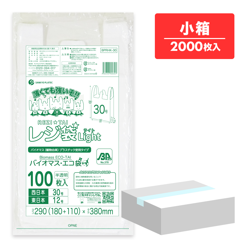 バイオマスプラスチック 25%配合 レジ袋 薄手 西日本 30号 (東日本12号) ブロック有 半透明 0.011mm厚 100枚x20冊 BPRHK-30kobako /手さげ袋 買い物袋 袋 S 業務用