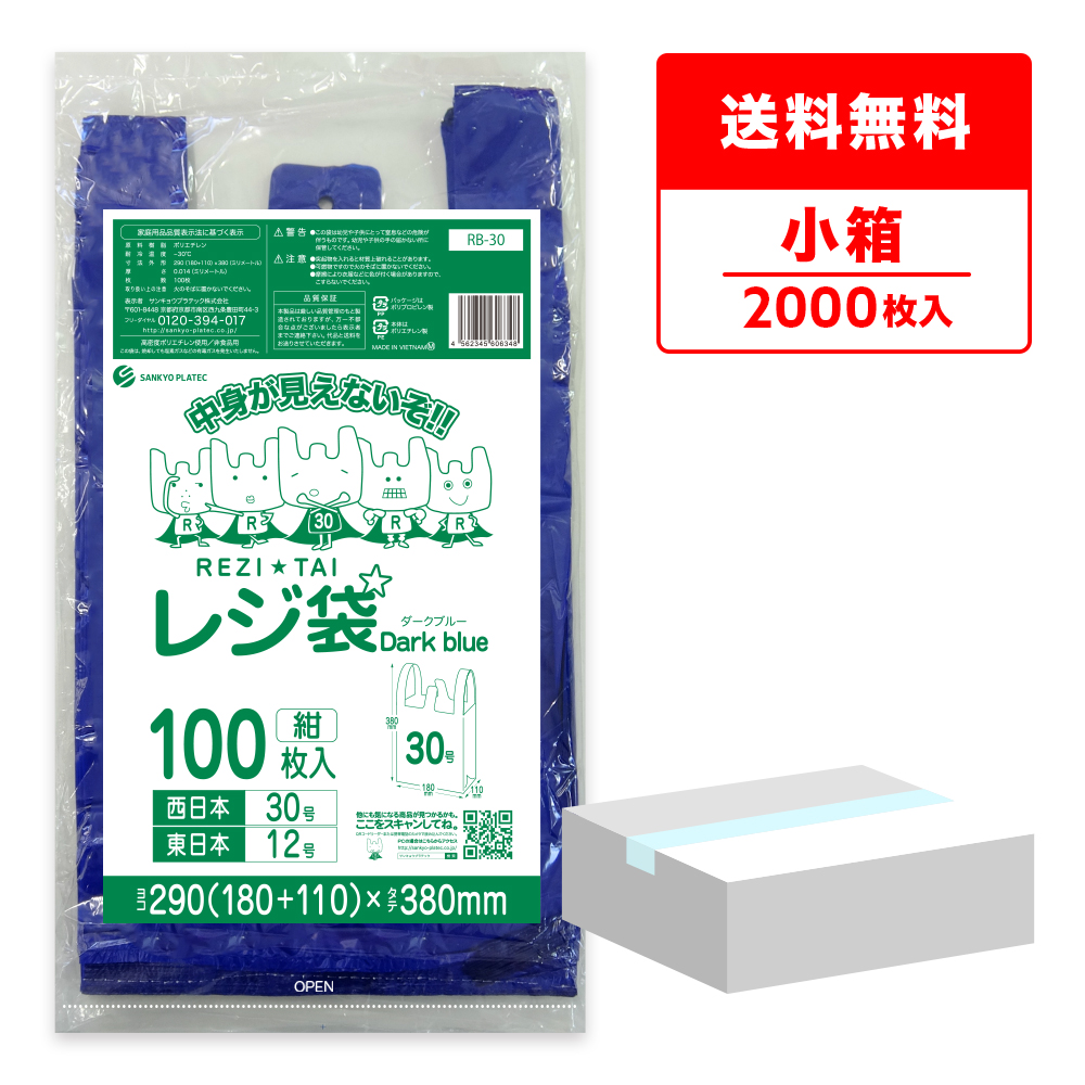レジ袋 厚手 ダークブルー 西日本 30号 (東日本12号) ブロック有 紺 0.014mm厚 100枚x20冊 RB-30kobako /手さげ袋 買い物袋 袋 S 業務用 送料無料