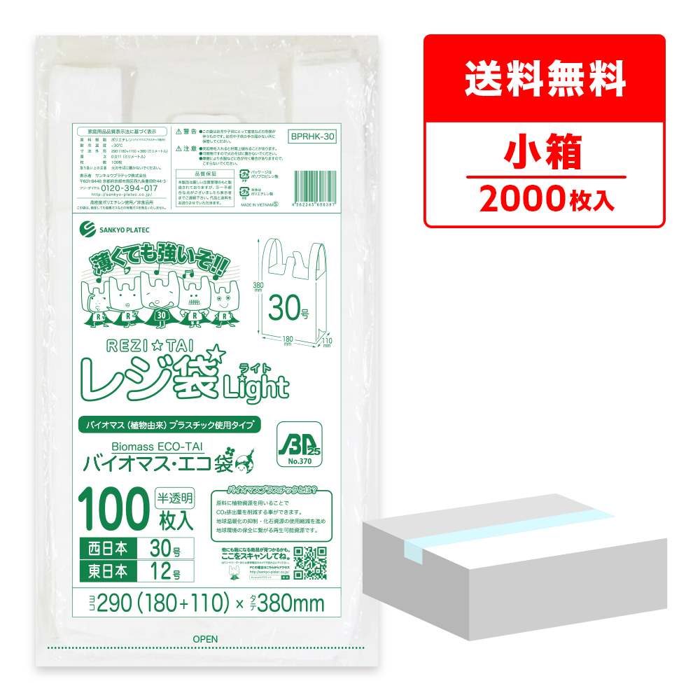 バイオマスプラスチック 25%配合 レジ袋 薄手 西日本 30号 (東日本12号) ブロック有 半透明 0.011mm厚 100枚x20冊 BPRHK-30kobako /手さげ袋 買い物袋 袋 S 業務用 送料無料