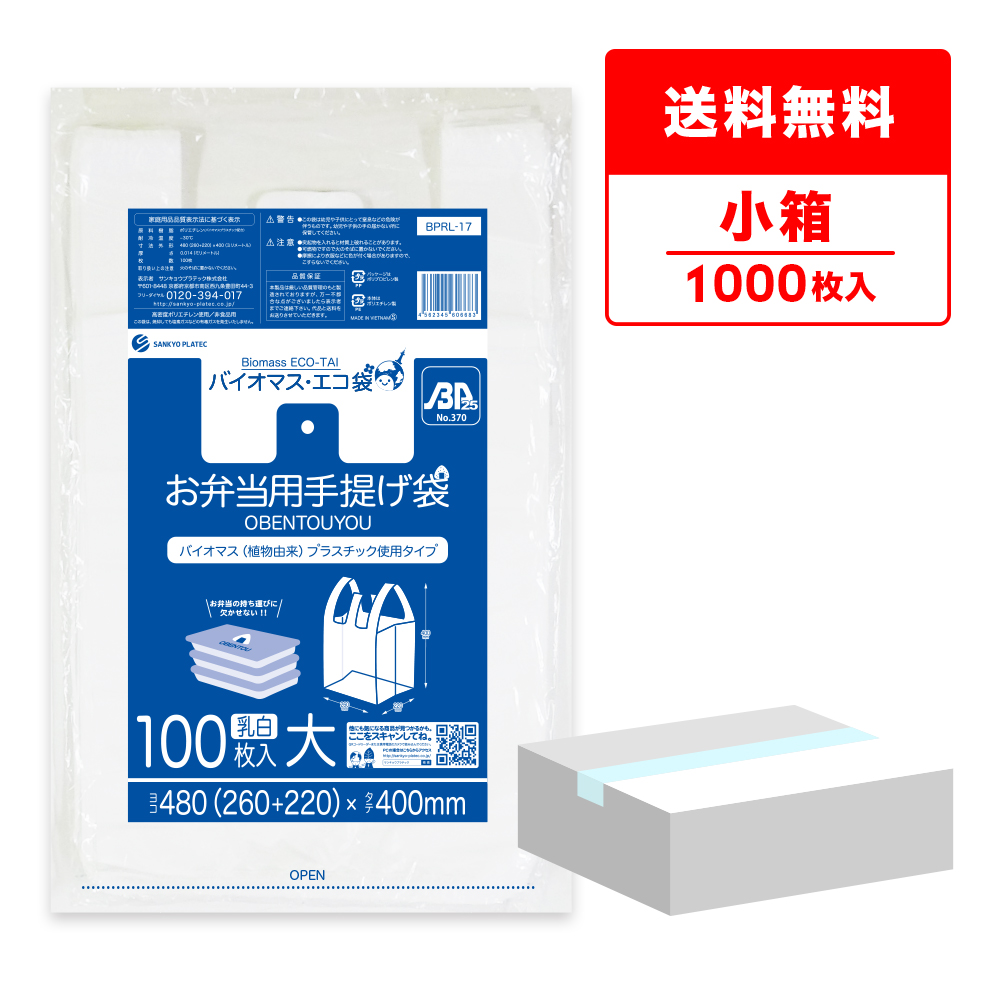 バイオマスプラスチック25%配合 お弁当用手提げ袋 大サイズ 乳白 0.014mm厚 100枚x10冊 BPRL-17kobako ブロック有 /手さげ袋 買い物袋 袋 持ち帰り用袋 テイクアウト ホワイト 業務用 送料無料