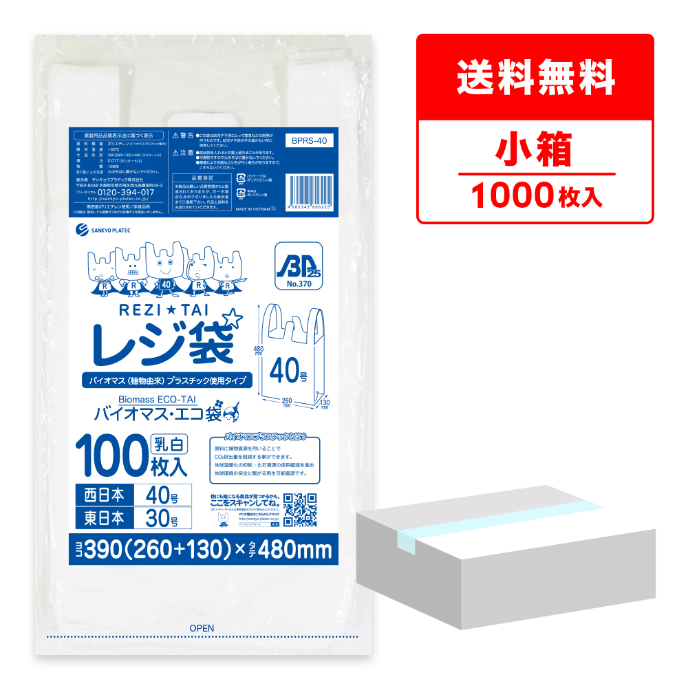 バイオマスプラスチック 25%配合 レジ袋 厚手 西日本 40号 (東日本30号) ブロック有 乳白 0.017mm厚 100枚x10冊 BPRS-40kobako /手さげ袋 買い物袋 袋 L 業務用 送料無料